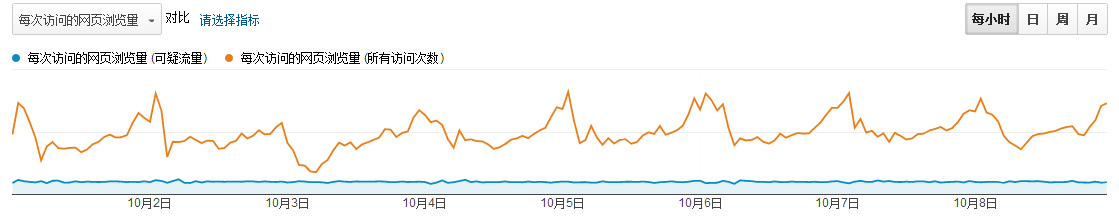 由于每次访问页面浏览量和页面停留时间在虚假流量中的设置比较简单。因此这两个指标也是我们辨别虚假流量的主要突破点。简单的按时间观察这两个指标的变化趋势就可以发现异常。在下面的图表中,虚假流量的每次访问页面浏览量几乎为一条直线,无任何变化,非常不自然,同时也与网站整体流量在该指标上的表现相差很大。