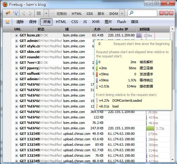 通过firebug插件中的网络选项卡,我可以知道网页在加载过程中,所有的请求的访问速度情况,如上面那条,通过对具体请求的详情查看,我知道了这个域名光解析竟然用了2秒钟,而等待响应竟然出有近2分钟。然后接收数据时间也不少。然后通过firebug还可以找出哪个请求链接用的时间最长。