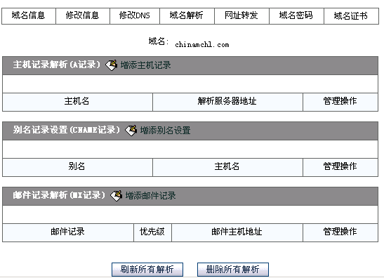 1>首先请进入域名管理。(登录会员->英文域名管理->在列表中找到chinamchl.com并点击"域名解析"),对于新申请的域名,您将看到以下图例: