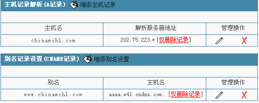 现以域名chinamchl.com为例,把域名www.chinamchl.com做别名至空间赠送的三级域名上(假设虚拟主机赠送的三级域名是aaaa.w41.cndns.com),以及chinamchl.com解析到虚拟主机上(假设虚拟主机的IP地址为202.75.223.*),完成后,您将可以用www.chinamchl.com以及chinamchl.com来访问您的网站,当然(解析完成后,还得在虚拟主机上绑定)