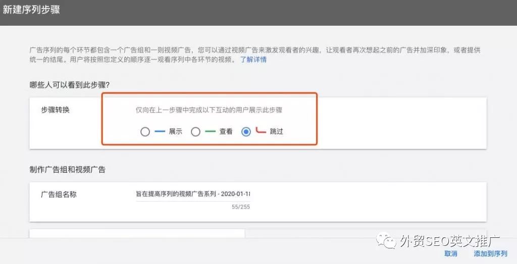 注意:投放视频广告的过程中,如果你选择广告系列子类型为“广告序列“,投放步骤会与上面步骤2和3稍有不同: