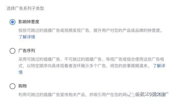 (1)选择目标,设置广告系列类型为视频,并选择具体的广告系列子类型