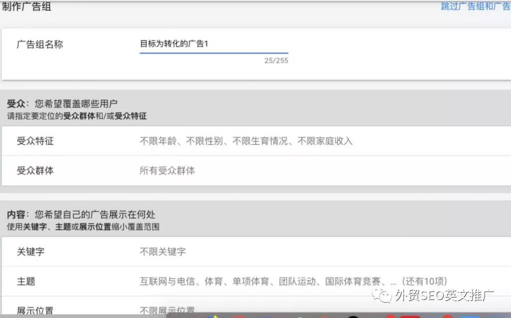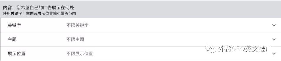 设置内容:你希望自己的广告展示在何处。(通过使用关键字、主题或展示位置来限制)