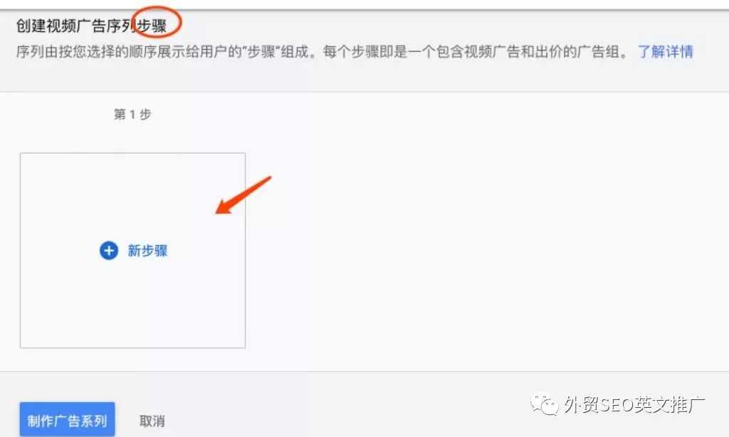点击+新步骤,开始设置第二个广告组和视频广告。