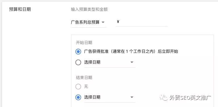 预算有两种选择:每日预算和广告系列总预算。注意:采用广告系列总预算时候,必须要为广告系列设置结束日期。
