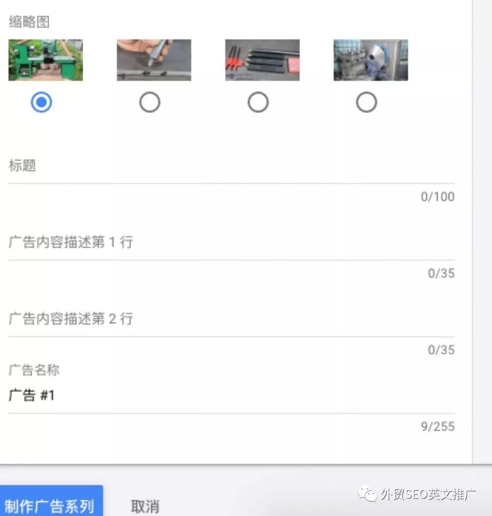 (2)对于视频发现广告,你需要完成以下信息:缩略图、标题、内容描述1、2和广告名称。